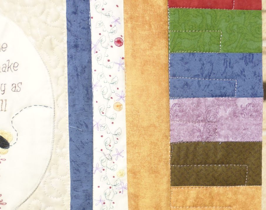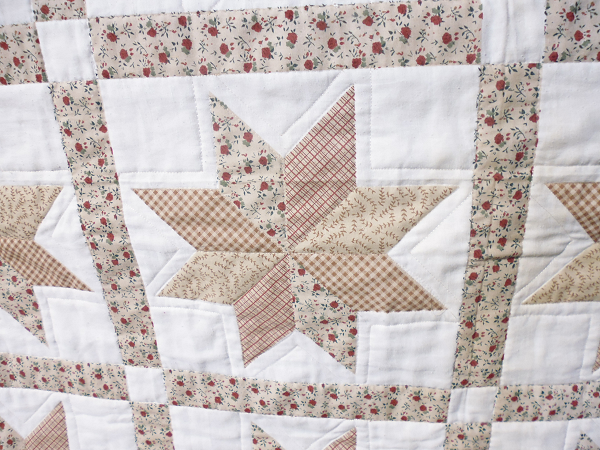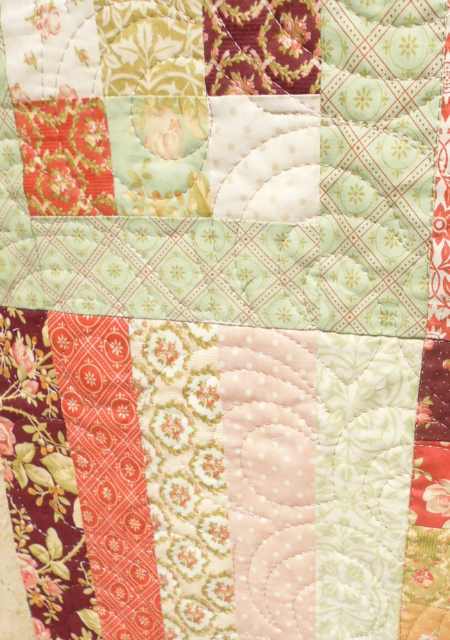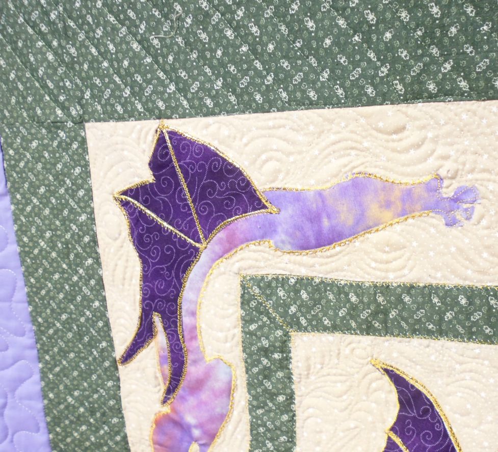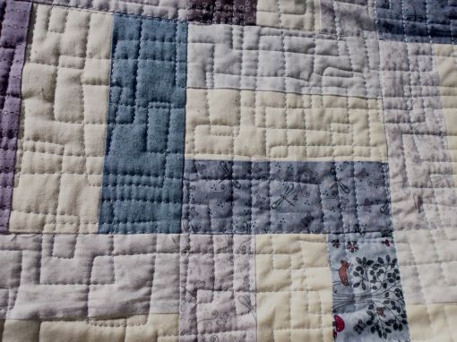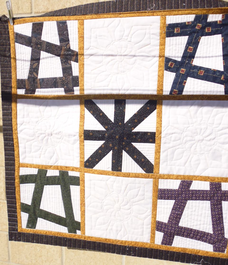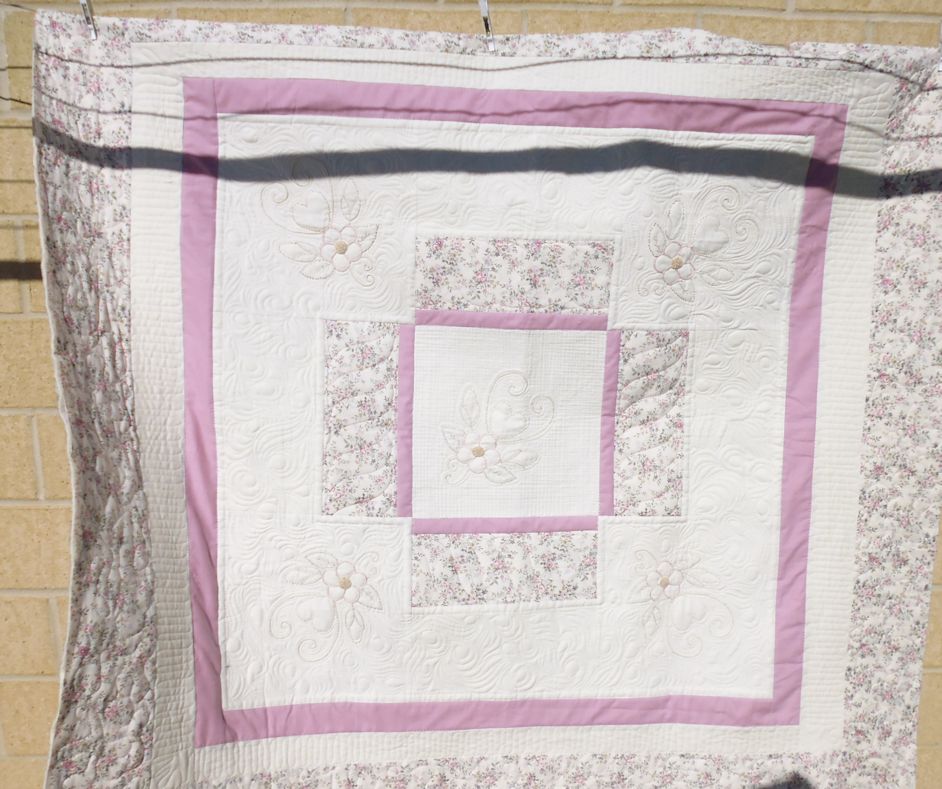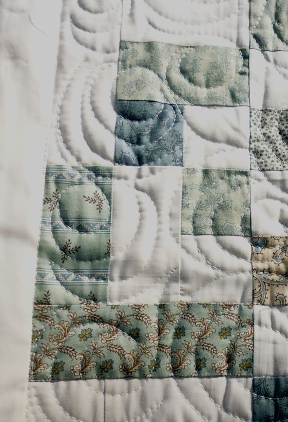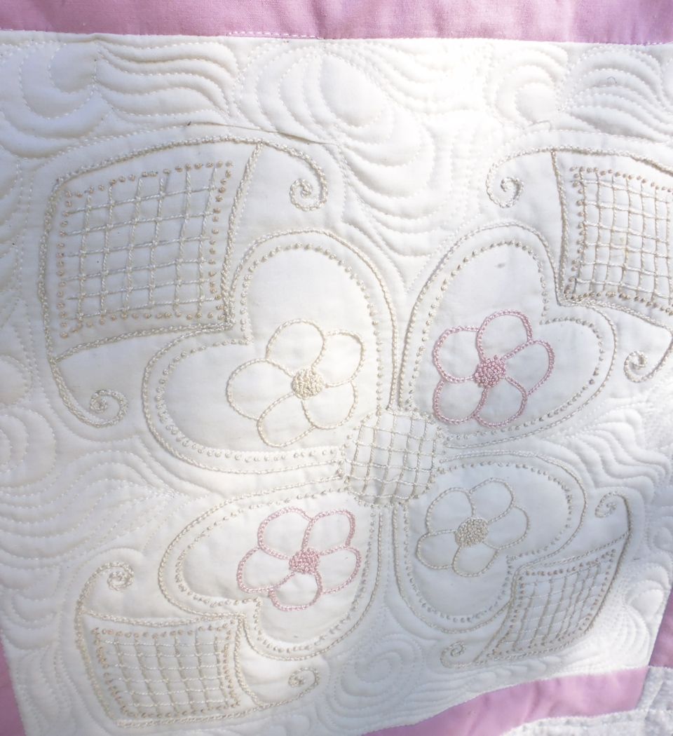 This quilt was similar to #400 (above), with all that candlewicking. As with #400, I stitched around each of the main embroidery lines, then echoed them, then did MacTavishing in the blocks to make the embroidered areas ‘pop’.