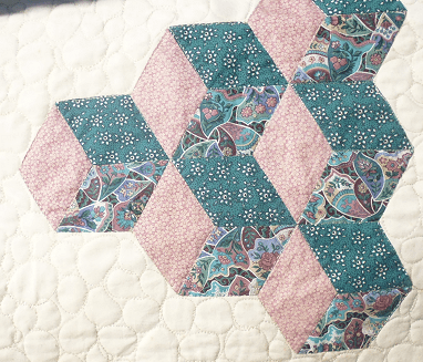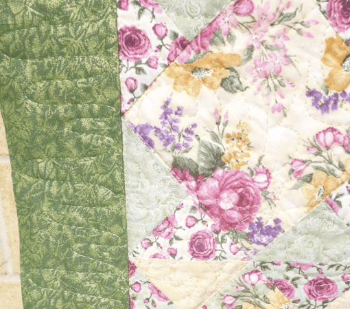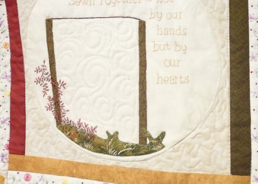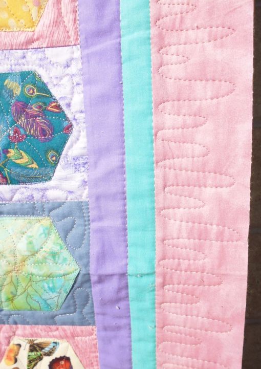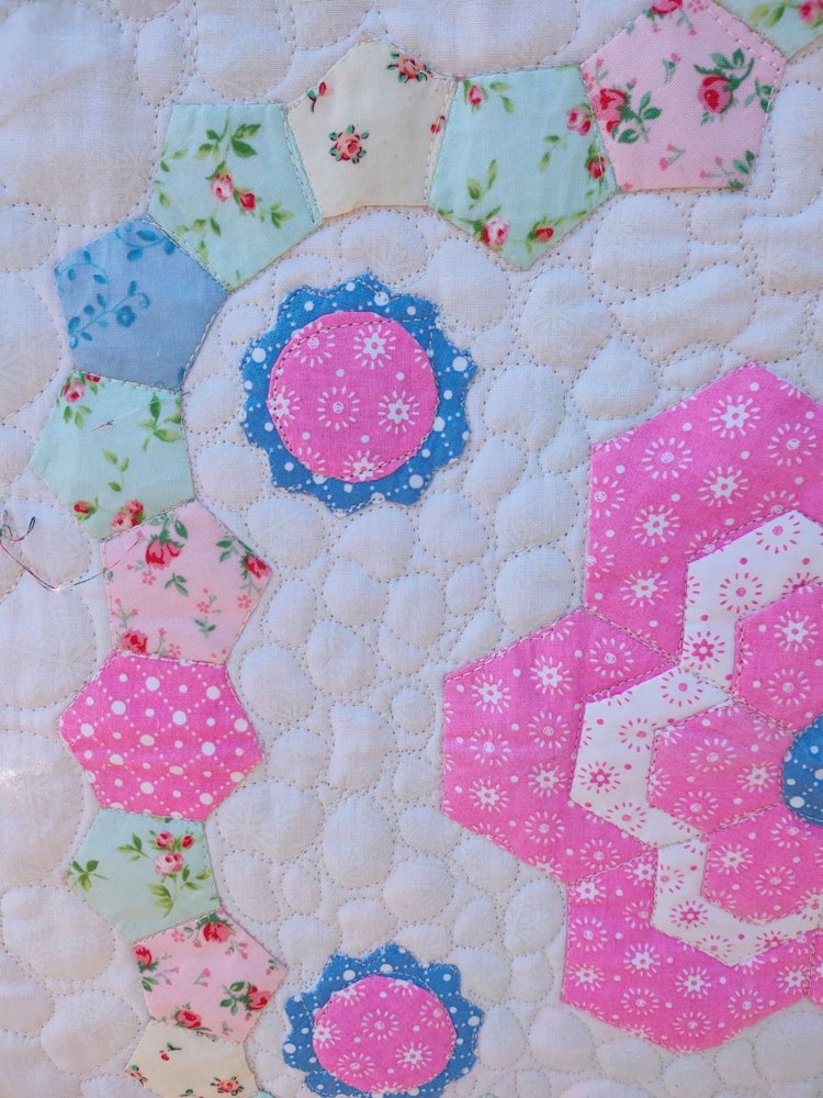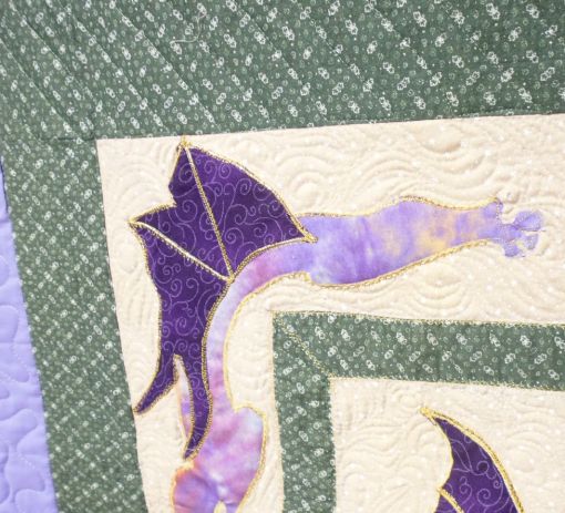 I used more of Cindy Needham’s templates for the flower motif in the borders, and for the sweeping curves in the outer border. I then echoed the sweeping curves, crossing over them to create a ribbon effect.