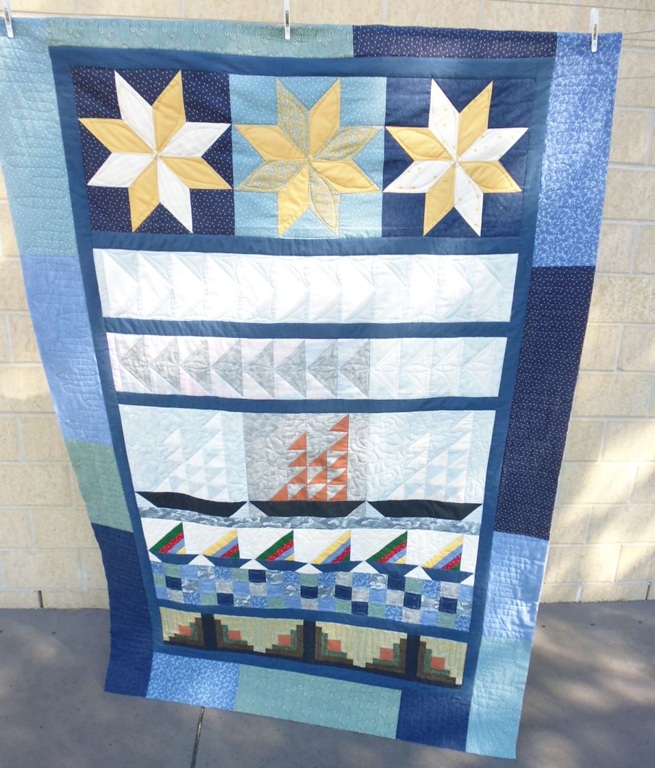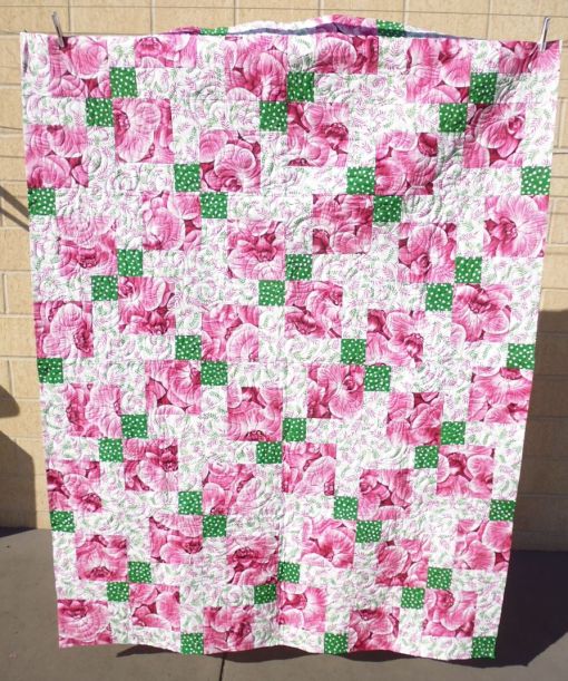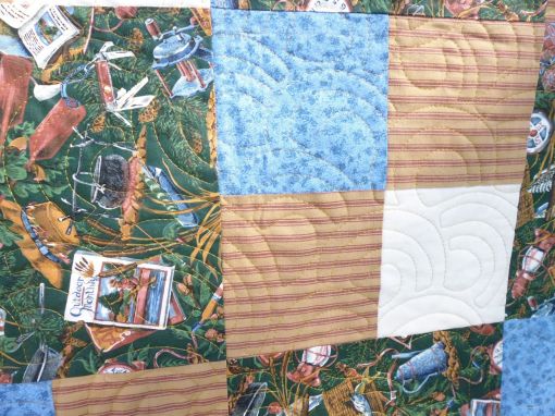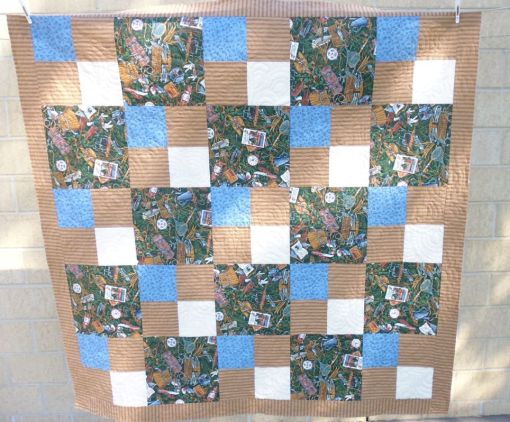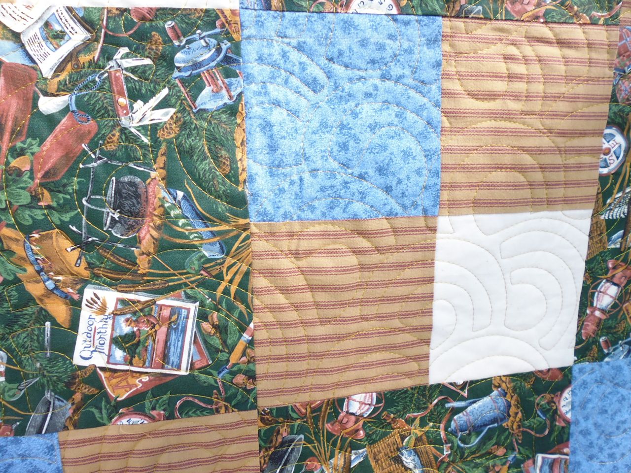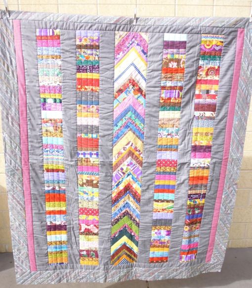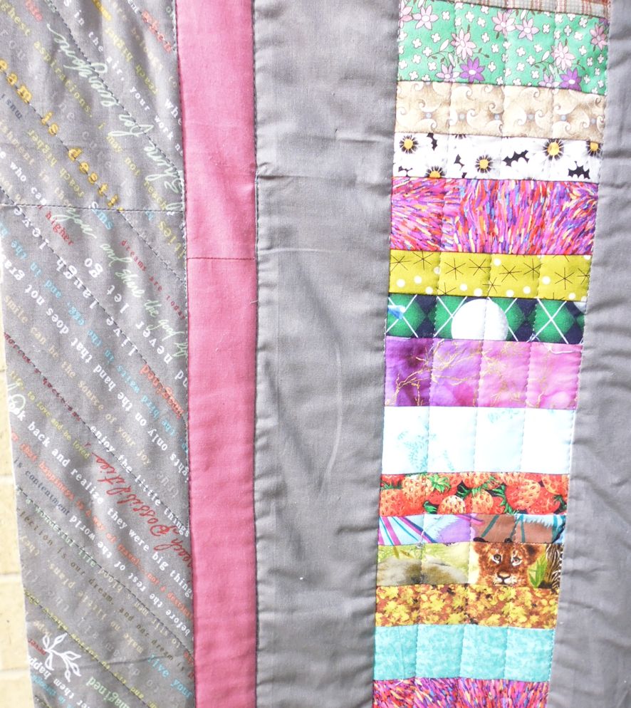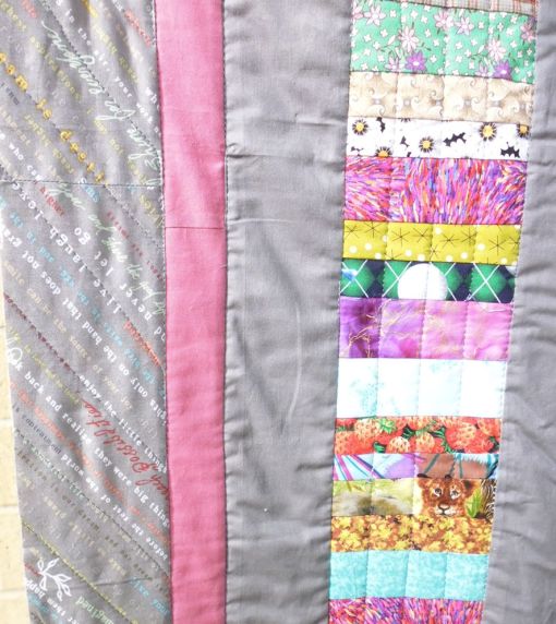 I made this quilt top back in February, and got it back for quilting! The spots in many of the fabrics meant it was easy to decide a motif — large circles/bubbles/pebbles in the main top (in yellow thread), then a motif I made up in my head of odd-length ‘pipes’ ending in round shapes (bobble heads?). I quite like the effect of those bobble heads and will likely do them again. And yes, I just coined a name for that motif — ‘bobble head’. You heard it here first, folks!