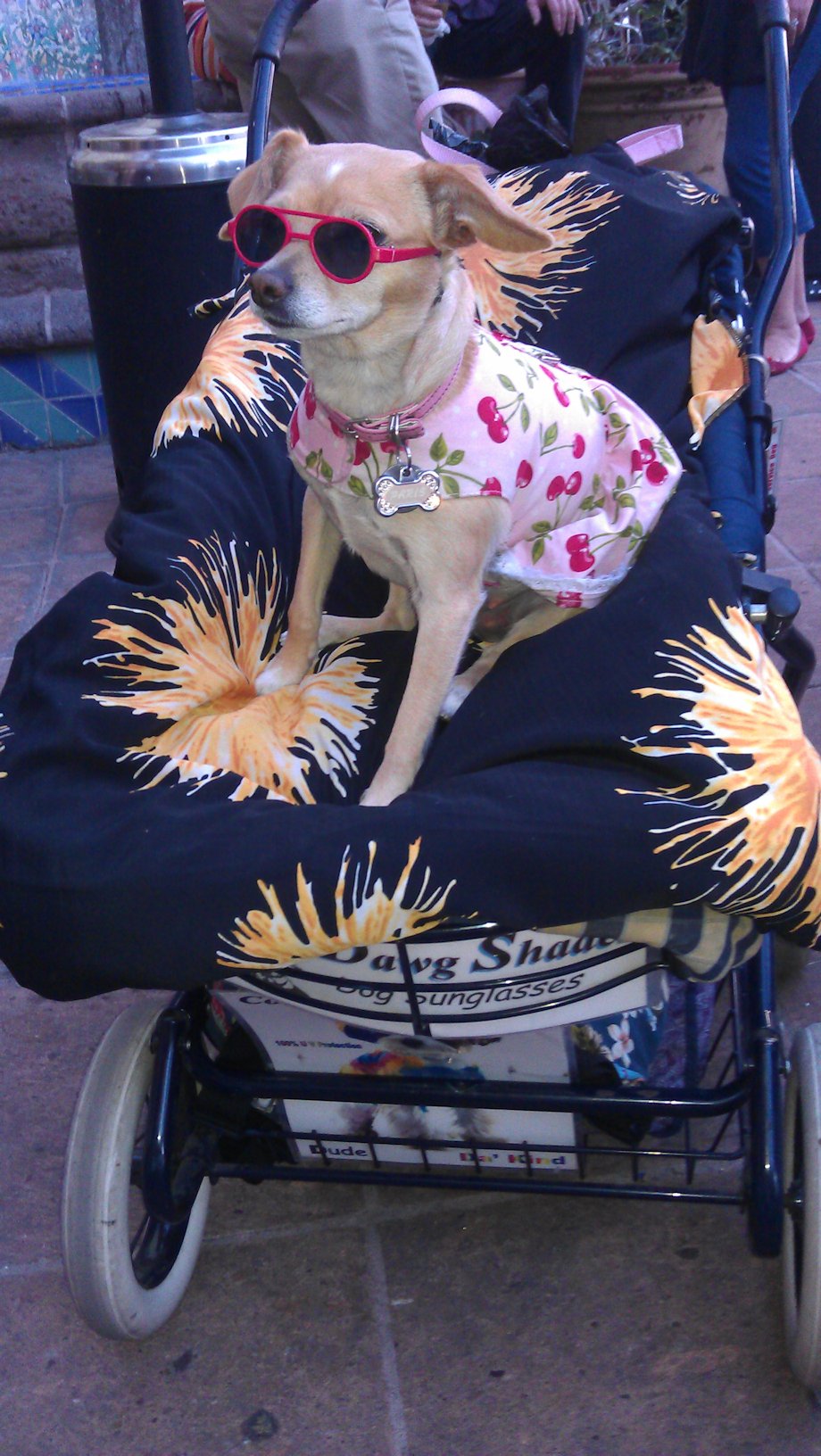 Yes, seriously! Two people were parading their dogs advertising their doggie sunglasses business. This one had these chic red sunglasses on, and was wearing a little dress (with a frilled skirt!) in a pink and cherry pattern. Only in Palm Springs… or Venice Beach!